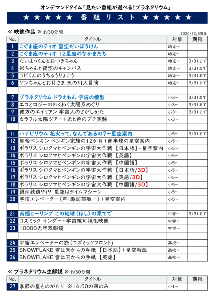 期間限定の番組、星空解説など、通常上映していない番組を見ることができるチャンス!