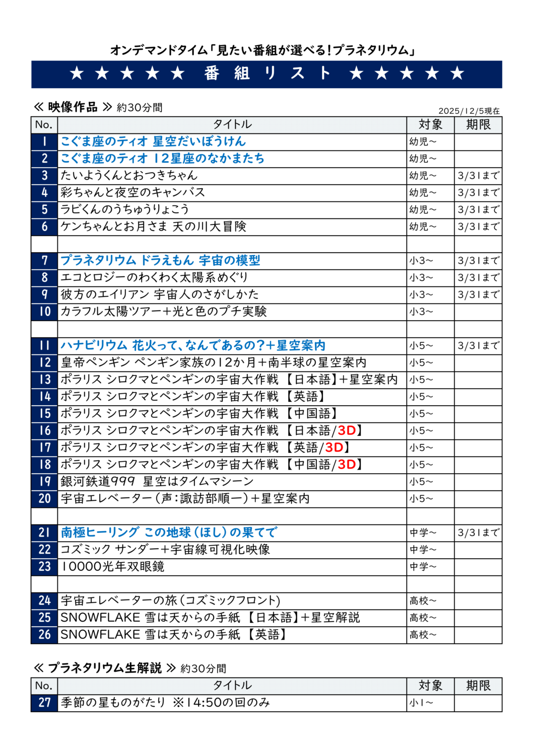 期間限定の番組、星空解説など、通常上映していない番組を見ることができるチャンス!