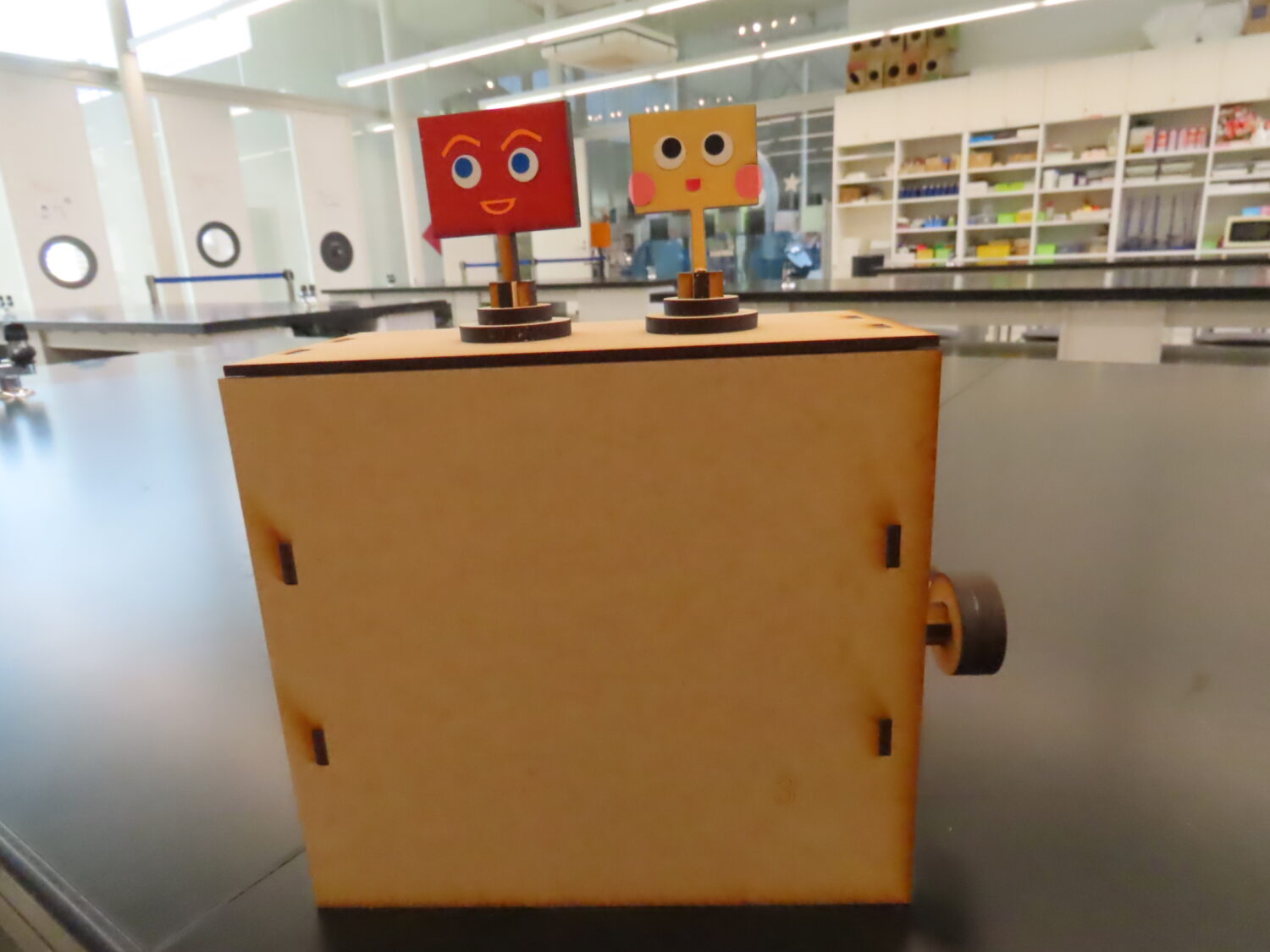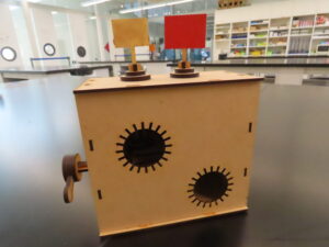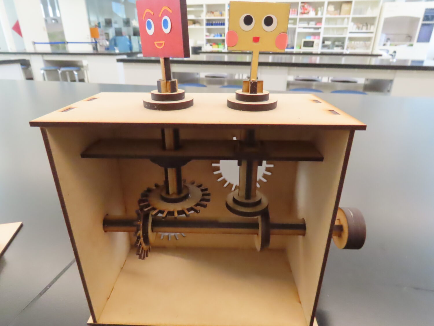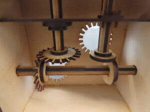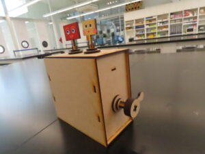 ハンドルを縦に回転させると人形の1つは回転し、もう1つの人形は上下に振動します。歯車と楕円クランクを使った工作です。少し難しい工作ですが、一緒に頑張って作ってみませんか。今回は上下に振動する人形に回転もできるような工夫を付け加えてみました。