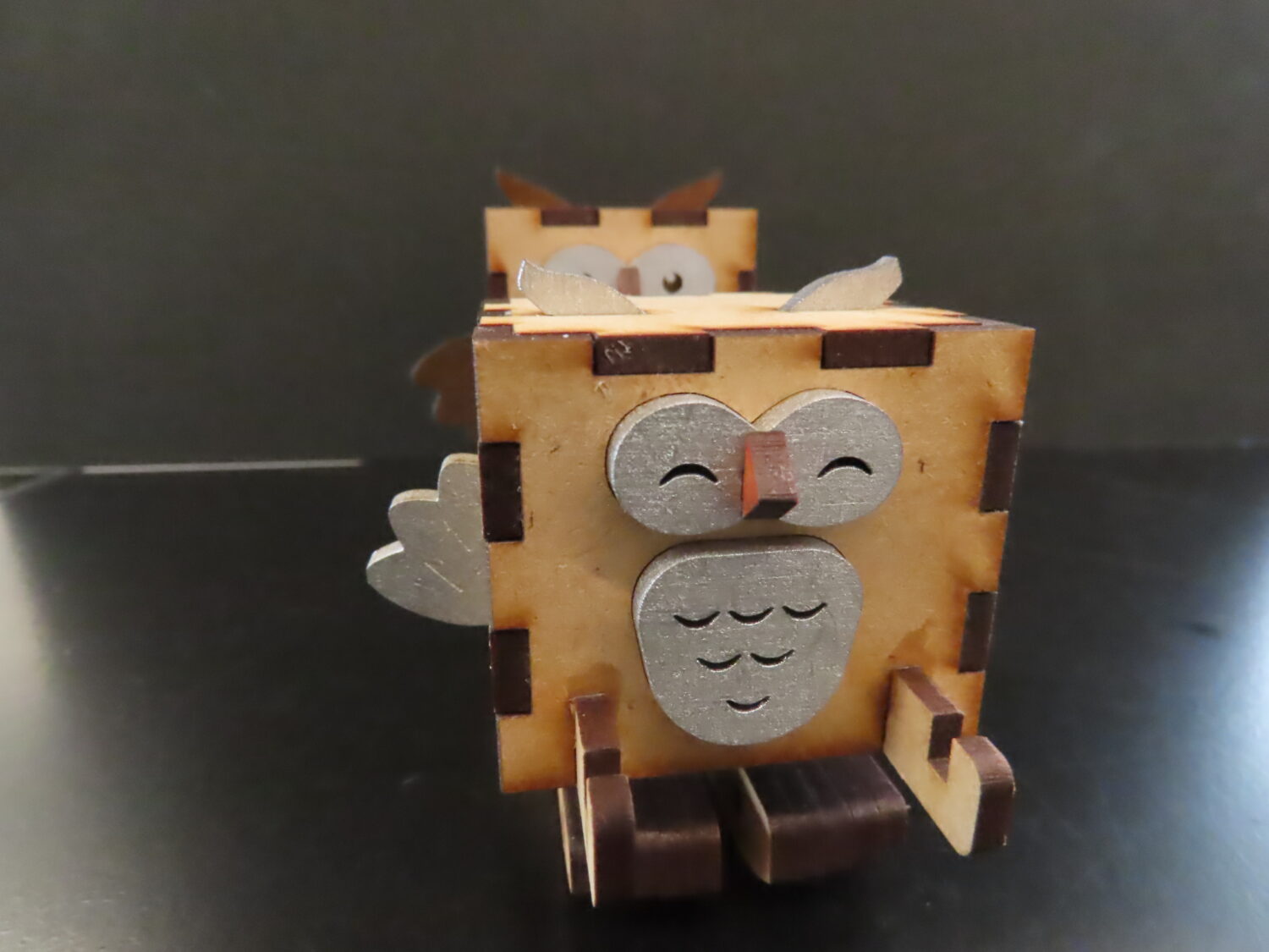 フクロウの親子。ちょっとだけ横につつくとゆらゆら揺れながら進みます。足をトコトコ動かし斜面を進む「いやし系」の工作です。平面でもおもりを使ってトコトコ歩かせることができます。足の工作を見直すことで、以前のものより壊れにくくなり、台紙を使わなくてもほとんどのテーブルの上で歩くようになりました。