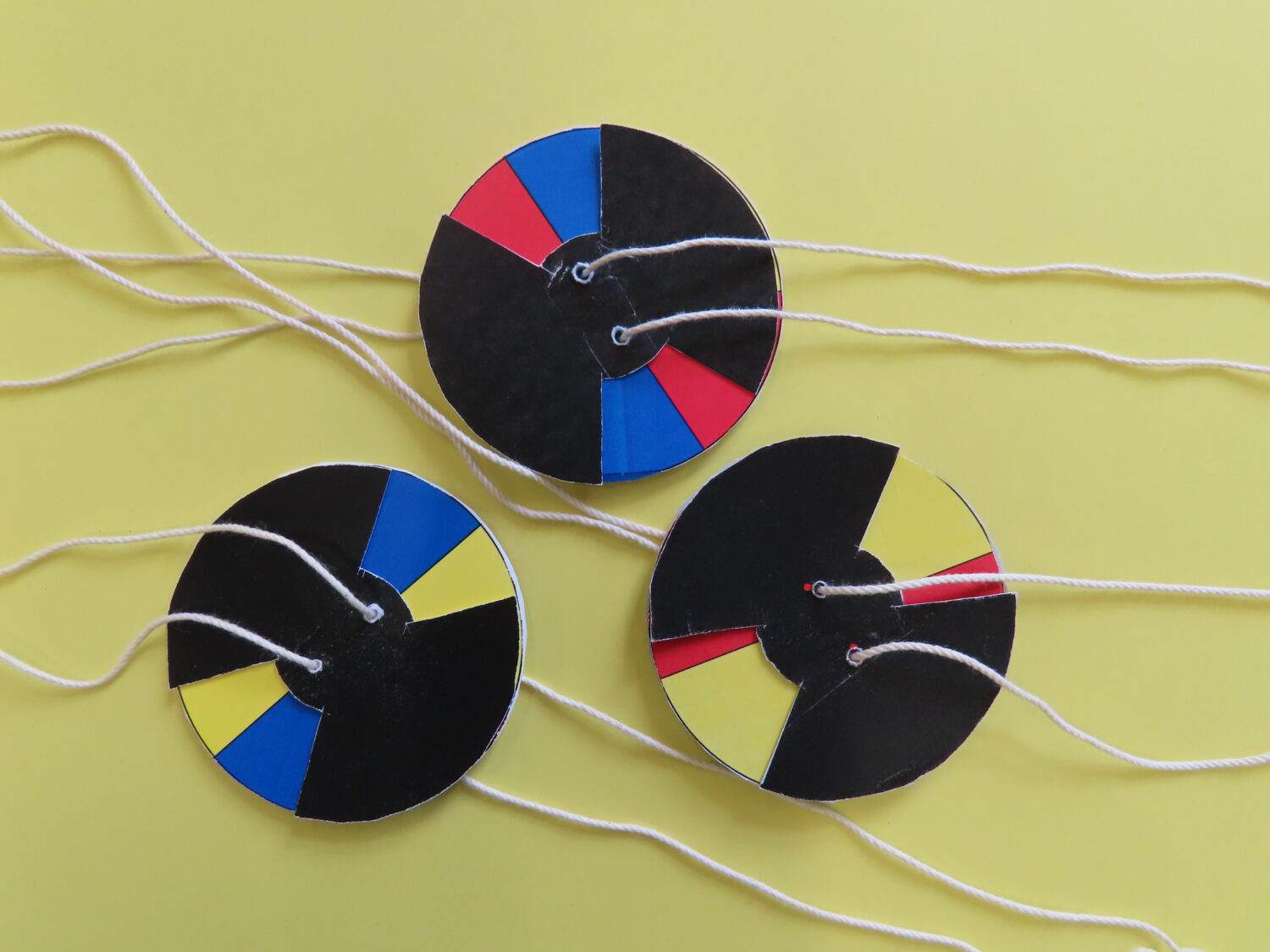 赤・青・黄の3色の円盤がこまの回転前後にずれることで色が変わります。