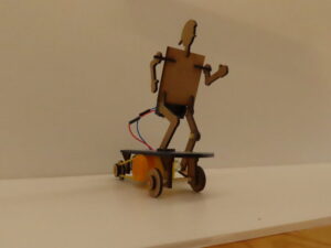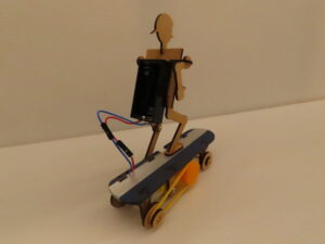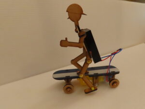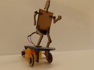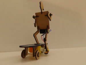 スケートボードに乗ったロボットがまるで足で地面をけって進むように見えるロボットです。実際、足はクランクを使って、スケートボード本体はプーリーを使って動かします。クランクとプーリーの動き方や用途の違いを一度に確認できるようにしました。※スケートボードを小さくするために少し細かい部品の接着が必要です。