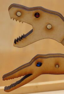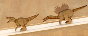 坂道に置くとトコトコ歩くトコトコザウルス。板を何枚か重ねてちょっと立体的にしています。今回作るのはスピノサウルスとティラノサウルスです。大きさは実スケールを意識して作っており、スピノサウルスが少し大きくなります。目にはビーズ玉をはめ込んでいます。