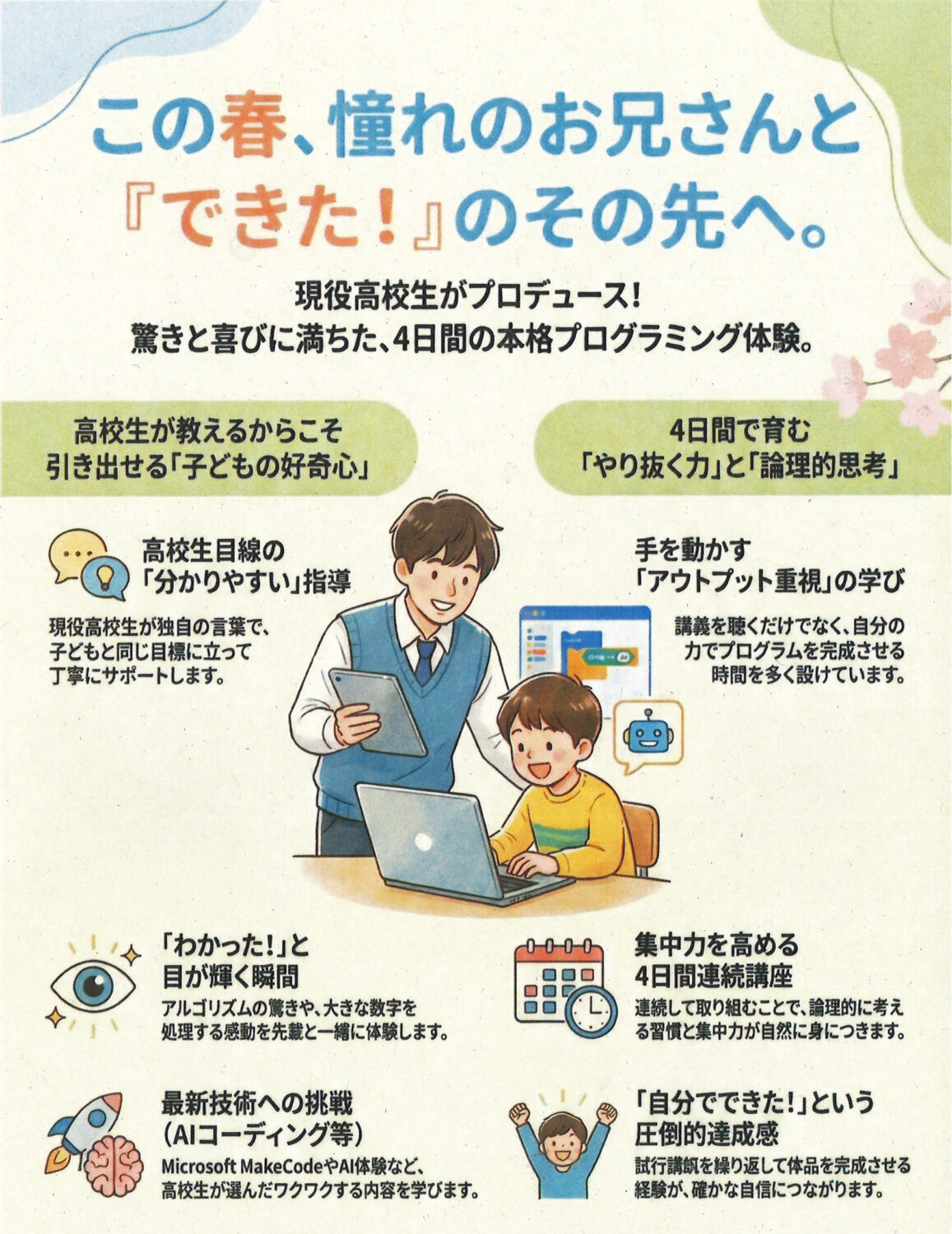 全4回・すべての回に参加ができる方が対象となります。高校生のお兄さんたちと一緒にプログラミングを深めませんか。