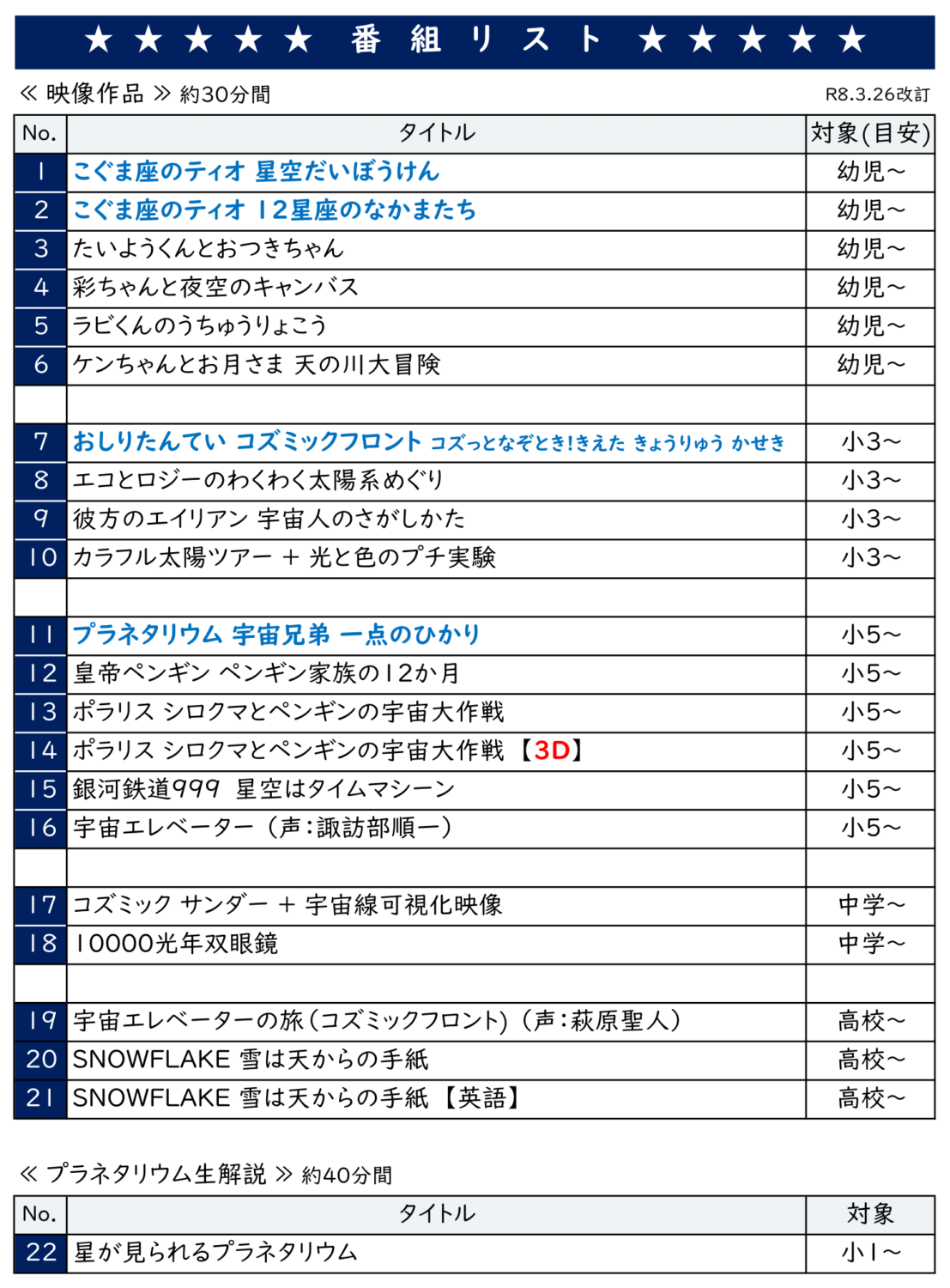 期間限定の番組、星空解説など、通常上映していない番組を見ることができるチャンス!